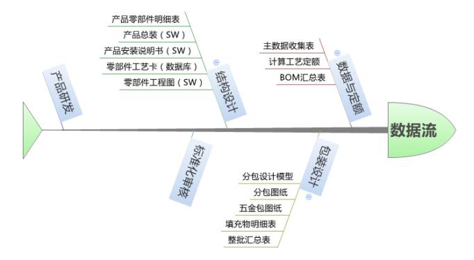 最終形成產(chǎn)品的材料明細(xì)表、總裝模型、加工圖紙、零部件工藝卡等。再交由包裝設(shè)計人員進(jìn)行分包設(shè)計,形成分包模型、包裝BOM、五金包圖紙、填充物明細(xì)表等設(shè)計數(shù)據(jù)。最后交由數(shù)據(jù)定額人員,制作最終的產(chǎn)品BOM以及編制工藝定額。